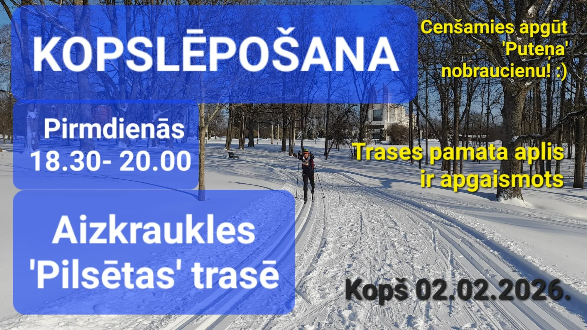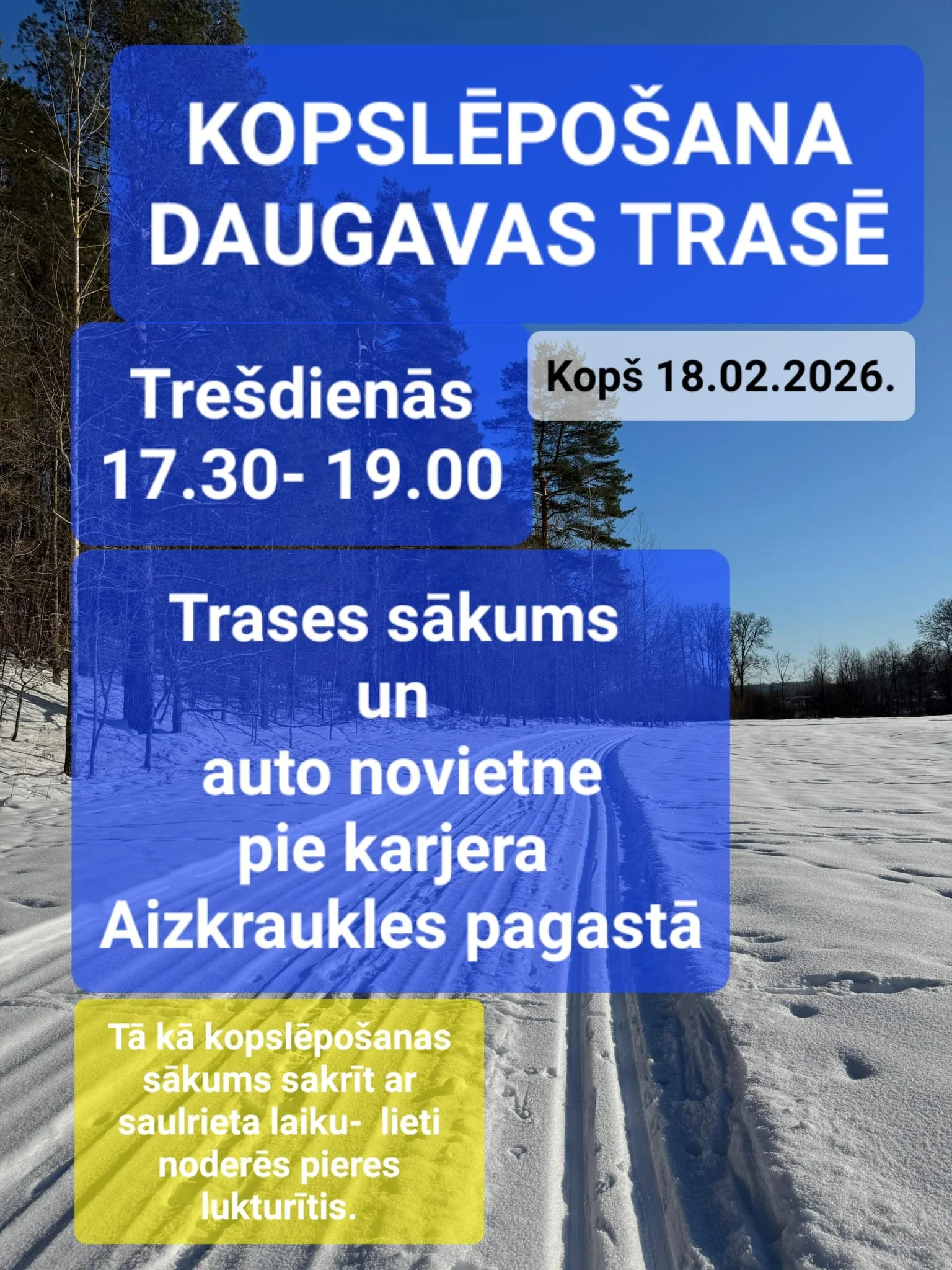 Kopslēpošana Aizkrauklē Monday, February 2, 2026 6:30 PM Monday, March 16, 2026 8:00 PM Google Calendar ICS Jau no februāra sākuma pirmdienās no pulksten 18.30-20.00 Aizkraukles veloparka slēpošanas trasē un trešdienās no pulksten 17.30 - 19.00 Daugavas trasē(sākums pie Aizkraukles karjera) notiek kopslēpošanas kopā ar Arti Zvejnieku.