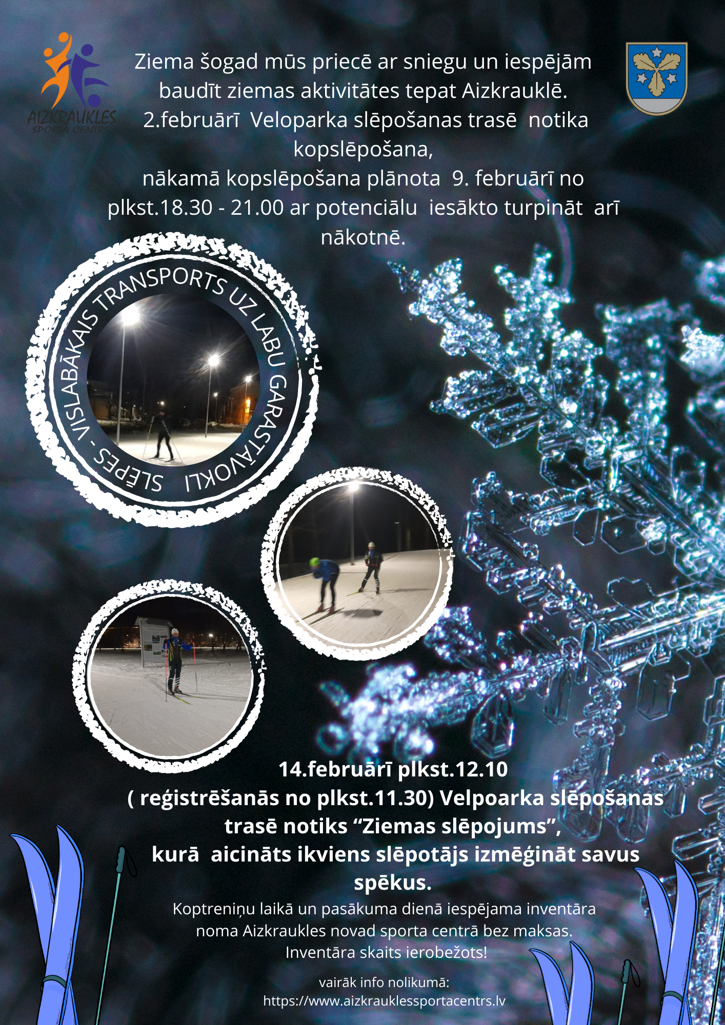 14.februārī plkst.12.10 ( reģistrēšanās no plkst.11.30) Velpoarka slēpošanas trasē notiks “Ziemas slēpojums”, kurā aicināts ikviens slēpotājs izmēģināt savus spēkus.