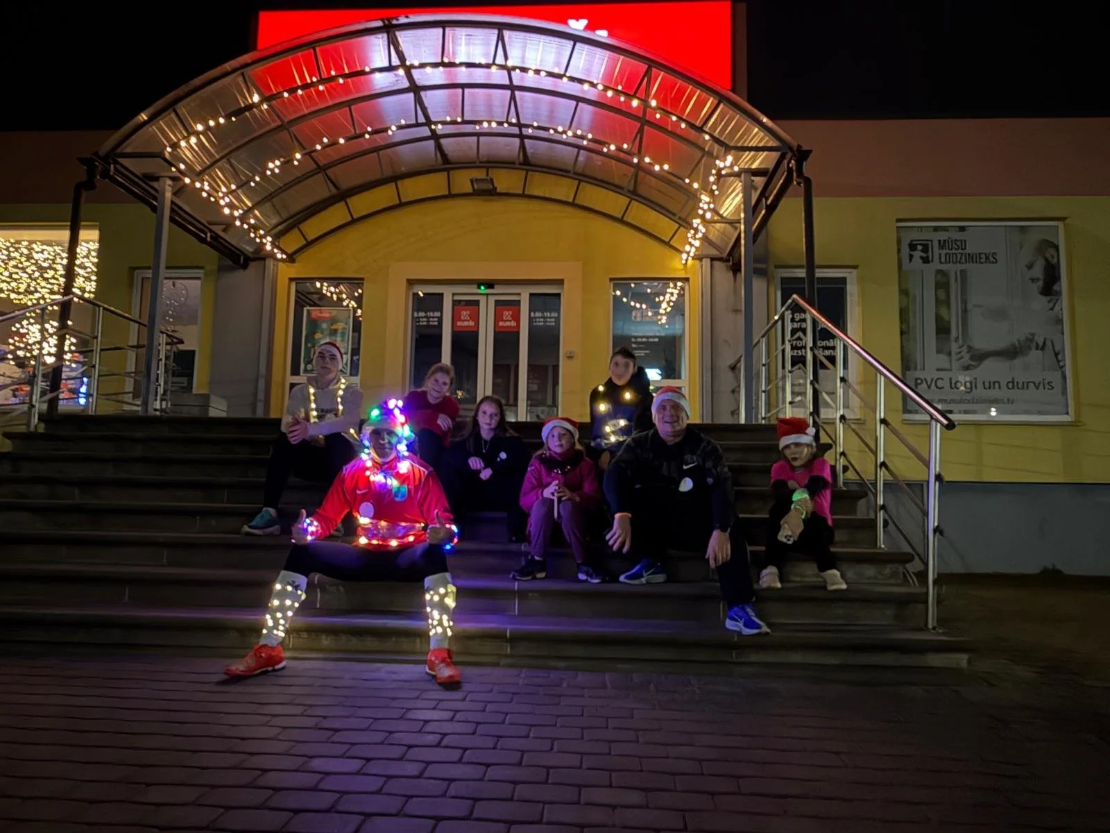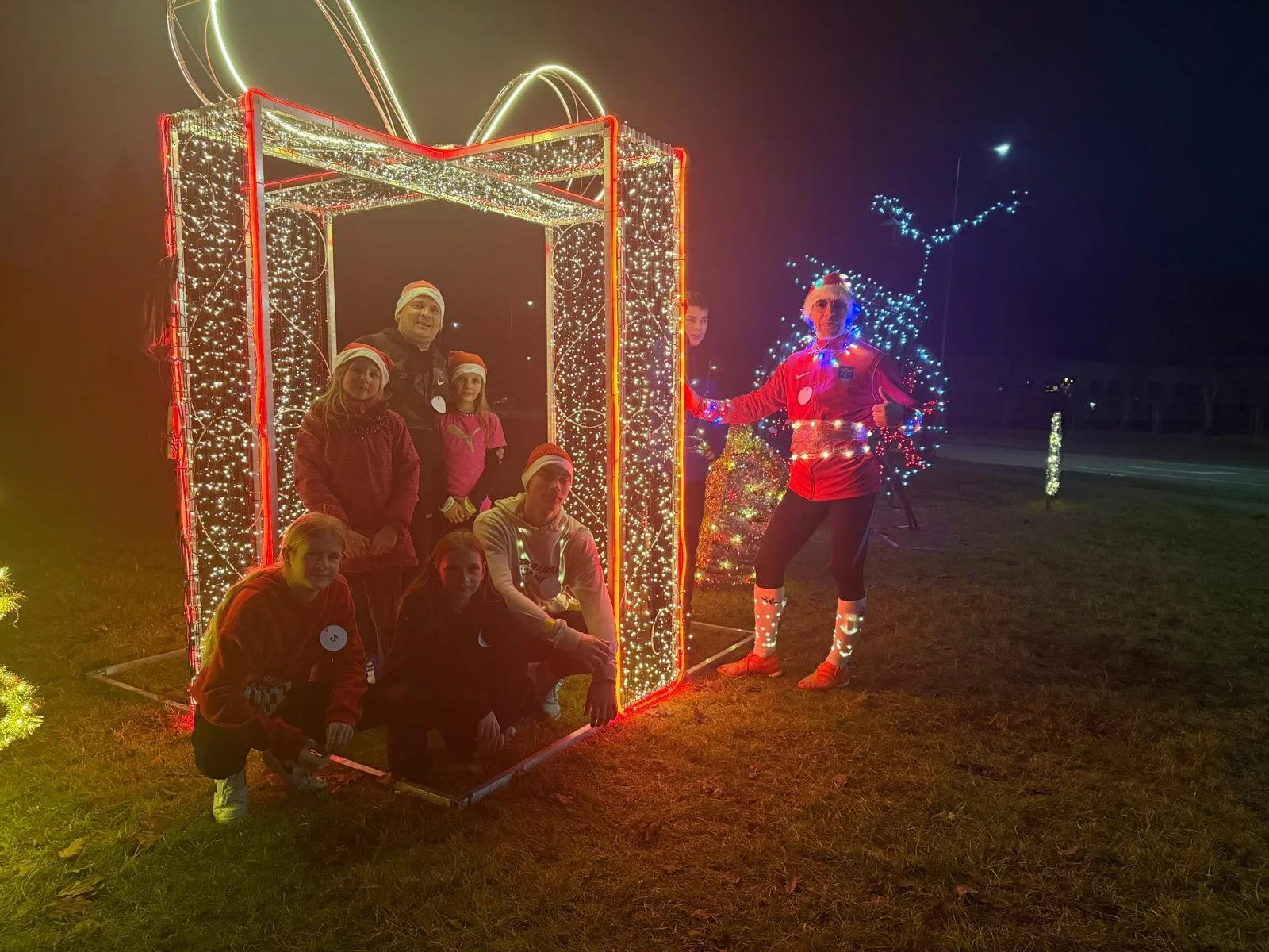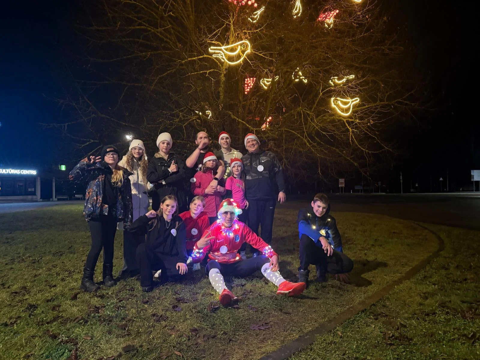 05.12.2025. Aizkraukles centrālajā laukumā- svētku egles iedegšanas pasākumā- starp viesiem jau pārvietojās rūķu cepuru nēsātāji un ar lampiņām rotāti topošā ‘Rūķu cepuru skrējiena dalībnieki.