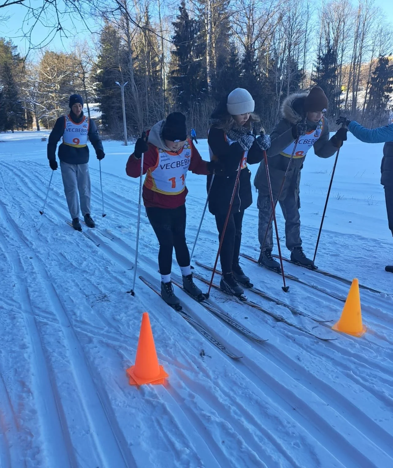 Sporta zālē tika veikta reģistrēšanās slēpojumam, numurkreklu saņemšana, slēpju saņemšana no skolas sporta inventāra aprīkojuma. Slēpotāji pa trotuāriem devās uz Mežaparka pļavas distancēm- 'Sniegpārsliņa' (500 m), 'Saullēkta sarma' (1.9 km) un 'Putenis' 3.9 km. Trasē līksmoja 12 slēpotāji. Slēpotāji veica kopfoto pie šodien saliktās koka slēpju sienas, kurā sarindotas vismaz 20 pāri vairāku gadu desmitus vecas bijušā Vecbebru tehnikuma skolēnu slēpes, tai skaitā glīti kopā sasietas slēpes ar iniciāļiem- Dzintra. Kas ir šī Dzintra?